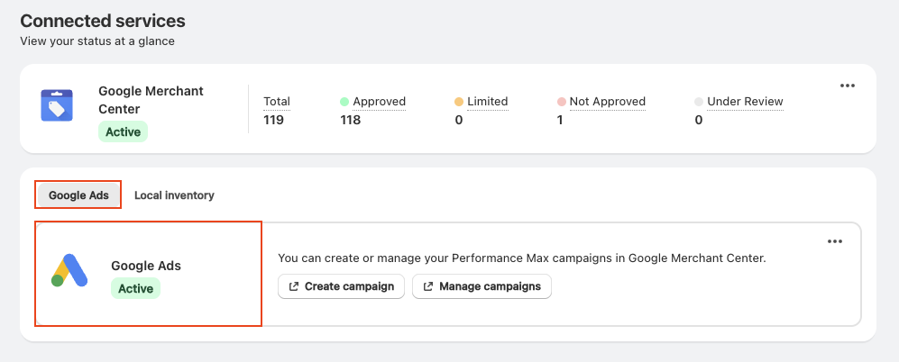Navigate back to the Overview tab within the Google & YouTube app. Locate the Google Ads section and ensure that is says Active.